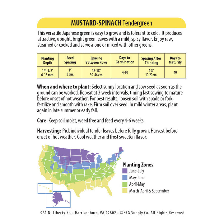 This versatile Japanese green is easy-to-grow and is tolerant to cold. It produces attractive, upright, bright green leaves with a mild, spicy flavor. Enjoy raw, steamed or cooked and serve alone or mixed with other greens.