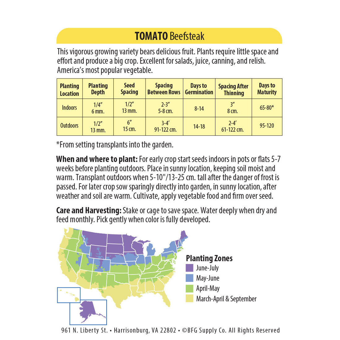 Care: Stake or cage to save space. Water deeply when dry and feed monthly.