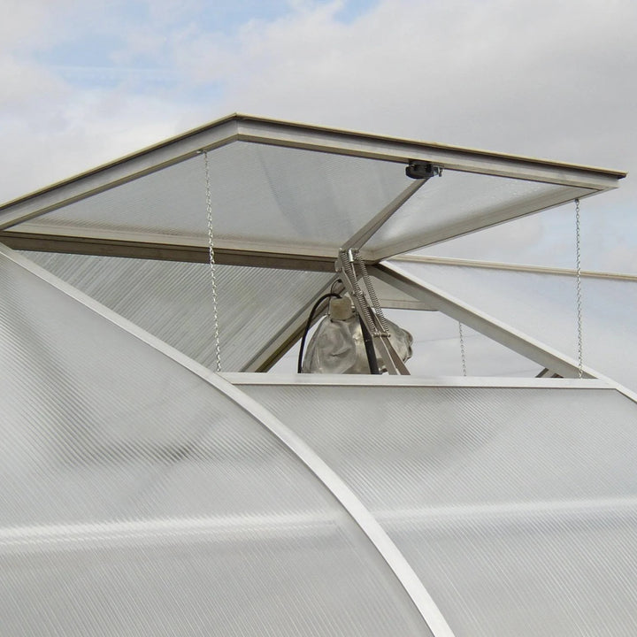 Most hobby greenhouses today use 4mm or 6mm polycarbonate panels, but the Riga offers superior 8mm twin-wall polycarbonate on the roof and side walls, while its end walls are reinforced with 10mm twin-wall polycarbonate. This advanced covering provides better insulation, keeping the greenhouse cool in summer and warm in winter. Its "onion" shape further enhances performance by allowing heavy snow to slide off effortlessly.