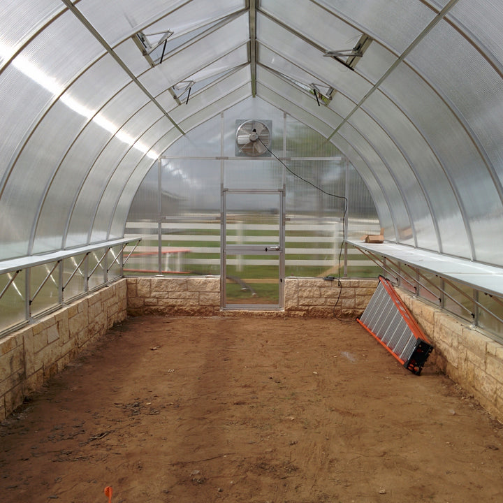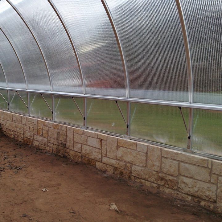 The Riga greenhouse can be supported by an optional heavy-duty 6" tall extruded aluminum base. Base can be placed directly on ground and if you choose, can be filled with sand, peagravel or concrete. Greenhouse frame slides directly onto base.