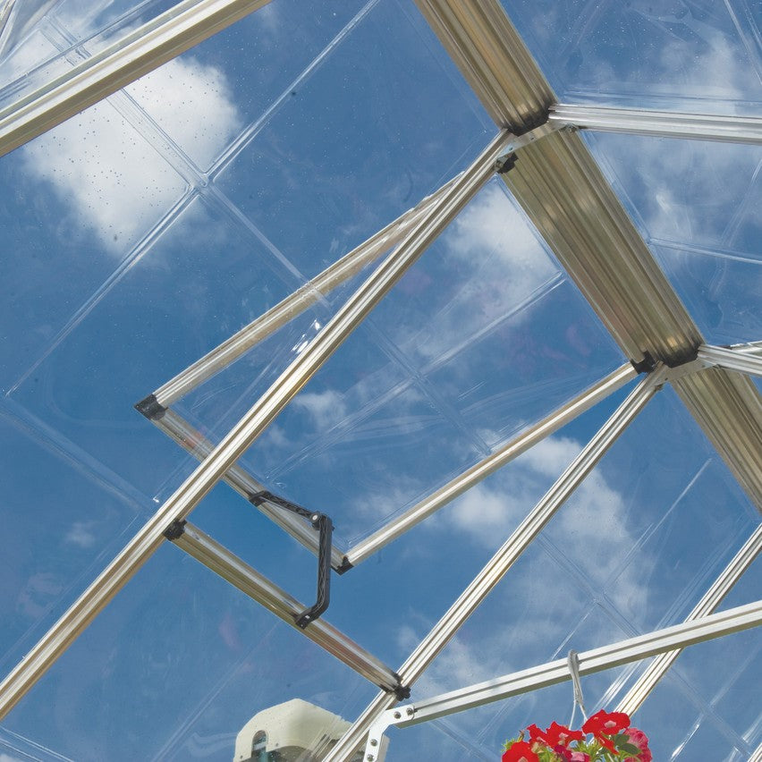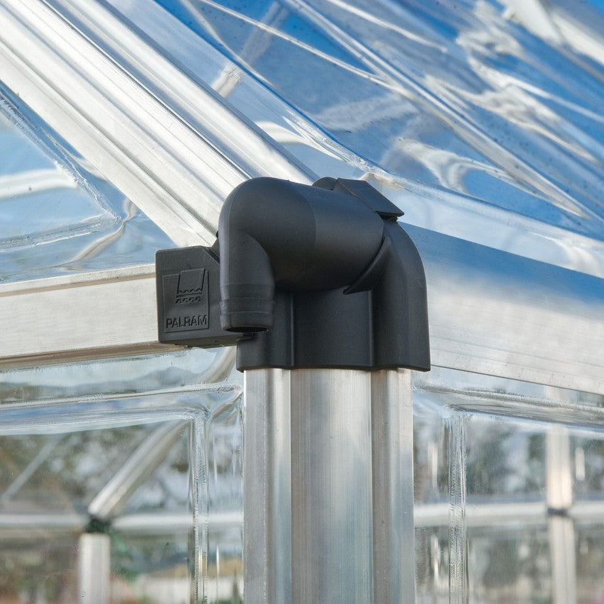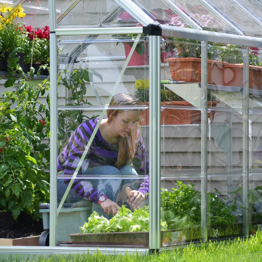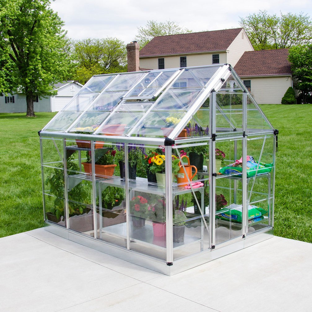 The Snap & Grow Silver 6' wide x 8' long greenhouse has been engineered from the ground up to get you growing quickly. Its exclusive SmartLock connection system eliminates the need for most tools and hardware, as the frame pieces lock together without screws, while the clear polycarbonate panels effortlessly slide into place and snap securely.