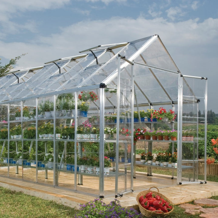 The Snap & Grow Plus greenhouse offers all the great features of our standard model in a spacious 8' wide design. With the innovative SmartLock connector system, assembly is incredibly fast and easy, making it one of the most user-friendly hobby greenhouses available. The durable, crystal-clear SnapGlas polycarbonate panels provide the clarity of glass while being virtually unbreakable, allowing maximum sunlight to nourish your plants. For optimal airflow and temperature control, the greenhouse features large double doors and an adjustable, preassembled roof vent. Its heavy-duty, corrosion-resistant aluminum frame ensures long-lasting stability and assembles quickly with the SmartLock system. Each model also includes anchoring clips for secure installation on wood or concrete foundations. Greenhouse gardening has never been this simple!