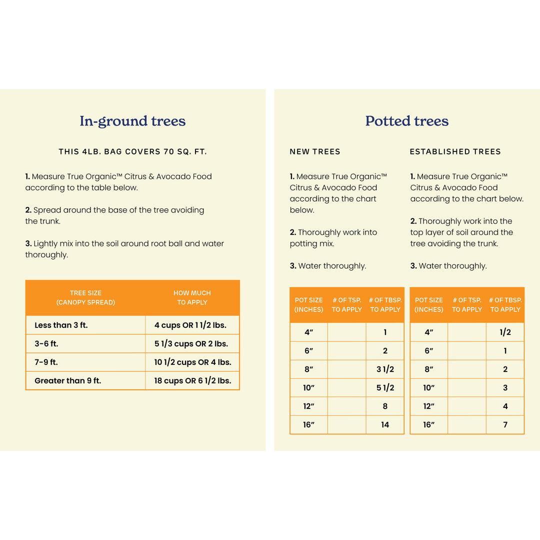 True Organic™ Citrus & Avocado Plant Food promotes lush green foliage and abundant blossoms and fruit. 7% calcium helps prevent blossom end rot. This exclusive blend is made from proven farm-grade ingredients including Seabird Guano, Shrimp, and Crab Shell meal. It can be used with in-ground and container trees.