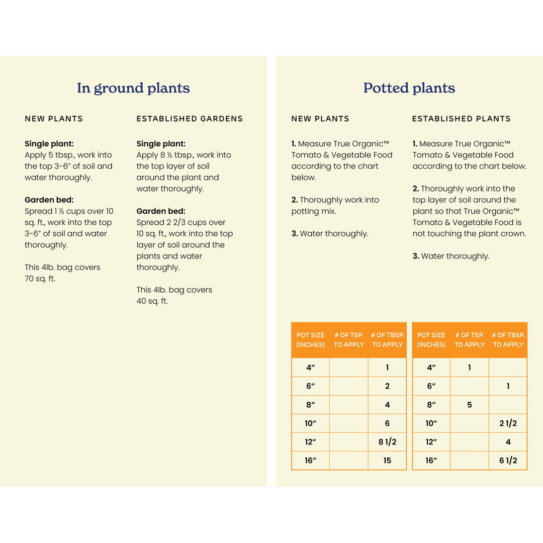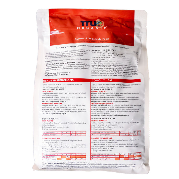 True Organic™ Tomato & Vegetable Food contains 6% calcium and is blended from natural & organic farm-grade ingredients that are used to make fertilizers for America's organic produce growers. The tomato and vegetable formula is proven to be extremely beneficial for both plants and soil. For in-ground and container plants. Apply once per month around your garden during the growing season to help grow superior harvests of organic fruits and vegetables. Contains seabird guano; a great source of phosphorous and slow release nitrogen, shrimp shell and crab shell meal; a sustained supply of calcium and nitrogen for soil and plants, poultry manure; ethically sourced from organically raised birds, and organically sourced soybean meal. No sludge, fillers or additives. One four-pound bag covers up to 70 sq. ft.