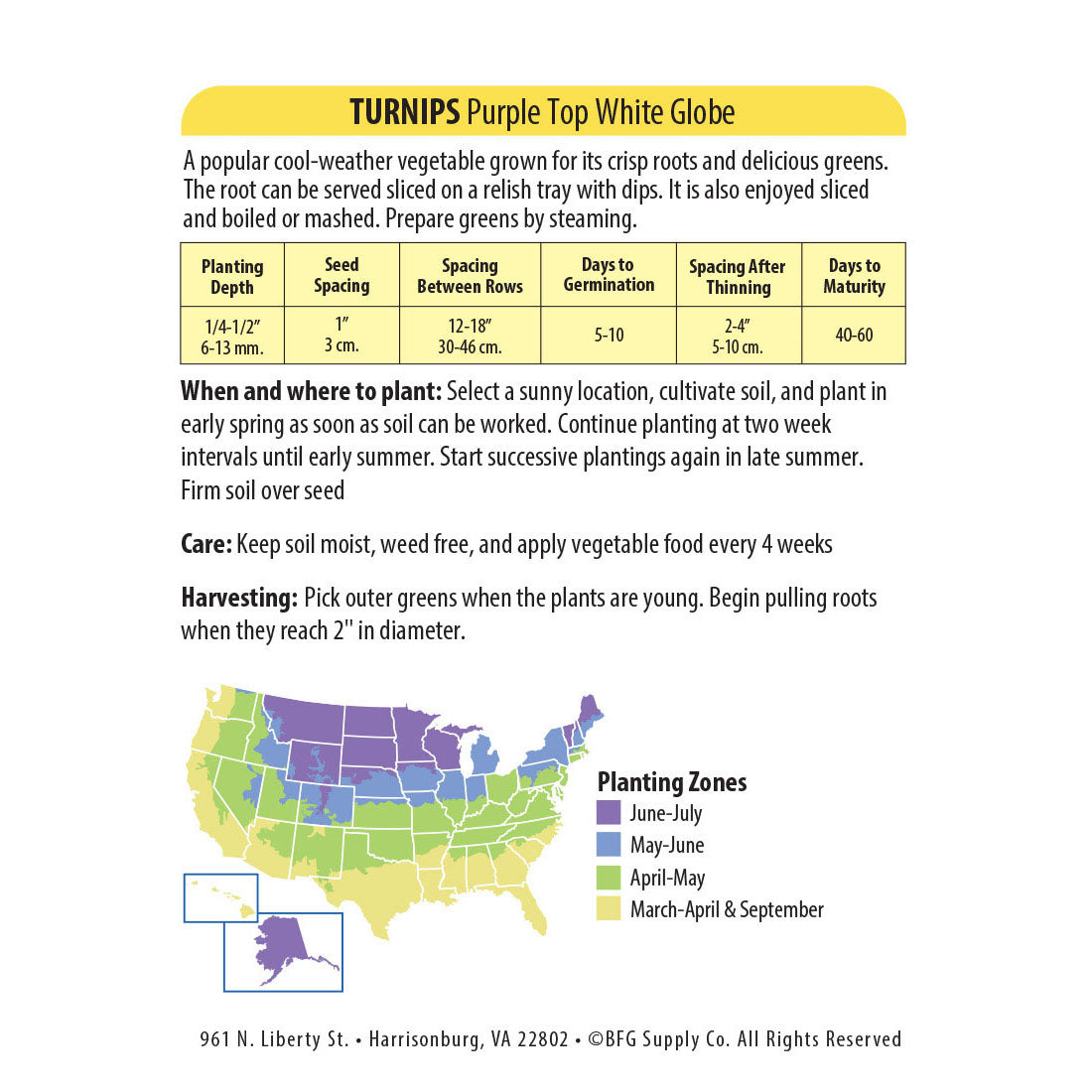 A high yielding hardy traditional variety that produces attractive roots and semi-erect prolific large lobed greens, the most widely grown turnip variety world wide. The edible smooth, slightly tapered globe shaped roots have tender, fine-grained flesh with a sweet and mild flavor. Best harvested when 3-4 inches in diameter. The top greens can also be cooked or used in salads. Good for storing, canning and freezing.