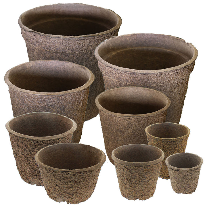 Containers are fiber molded, meaning they are made of recycled material, biodegradable, and usually decompose in about a year's time. This significantly minimizes waste production and also allows them to be planted directly into the soil.